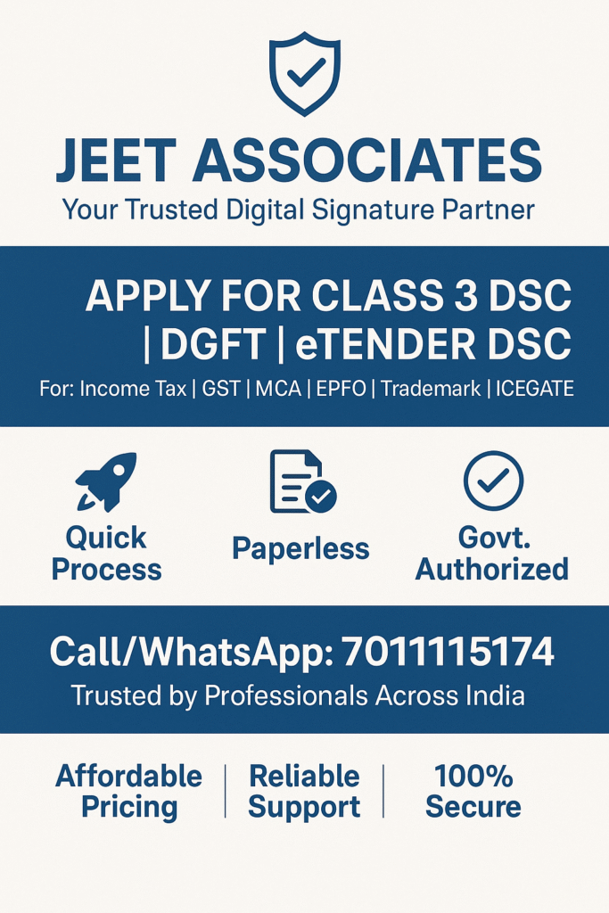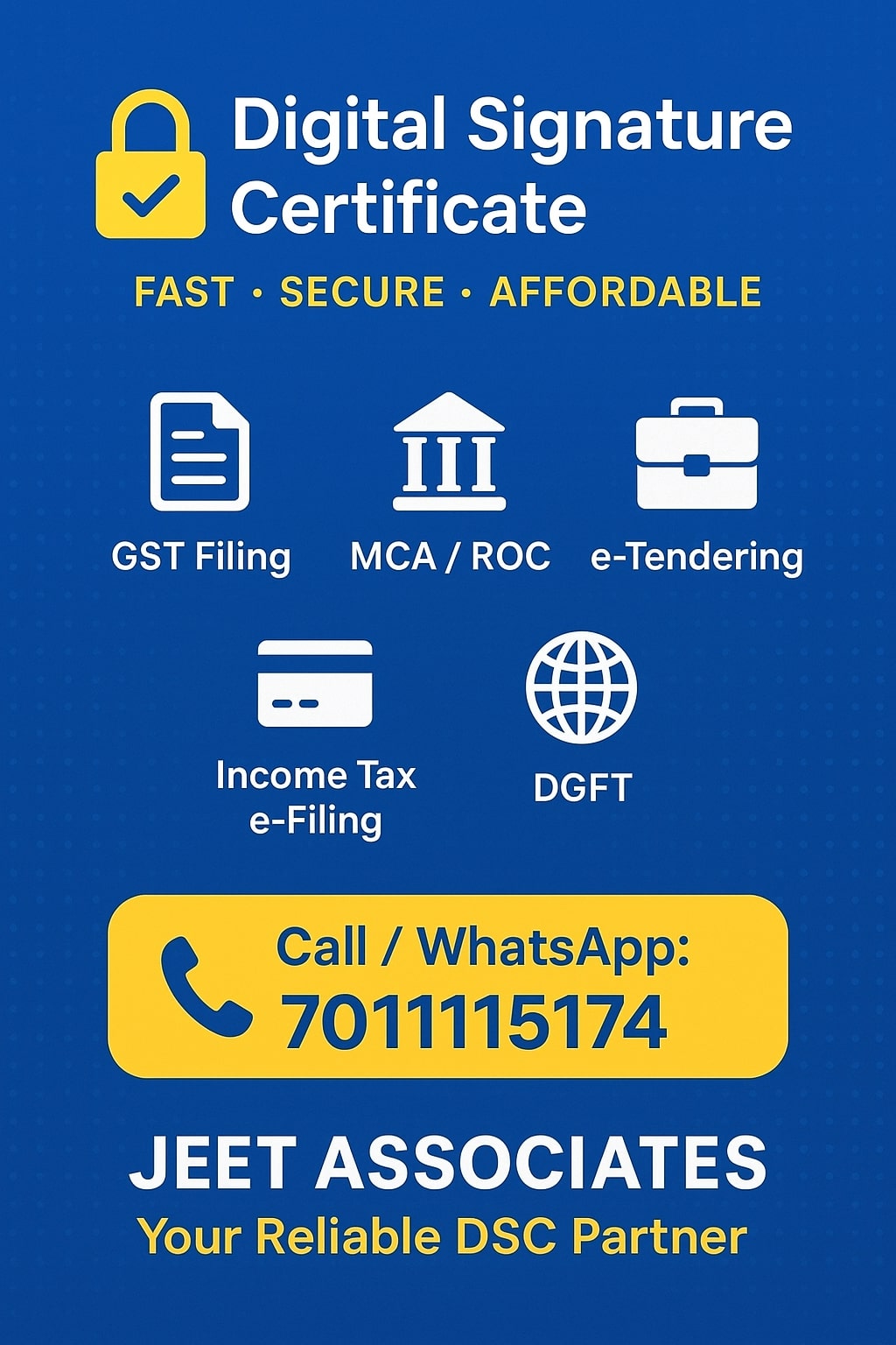 Looking to file Income Tax, MCA, DGFT, or participate in e-Tendering?๐ Get your DSC (Digital Signature Certificate) within 15 minutes! ๐ฏ Fast Service | ๐ผ For Individuals, Companies & Government Use | ๐ฏ Trusted๐ Contact Now: 7011115174๐ Jeet Associates โ Your Trusted Digital Partner ๐ฒ Message us on WhatsApp to get started now!